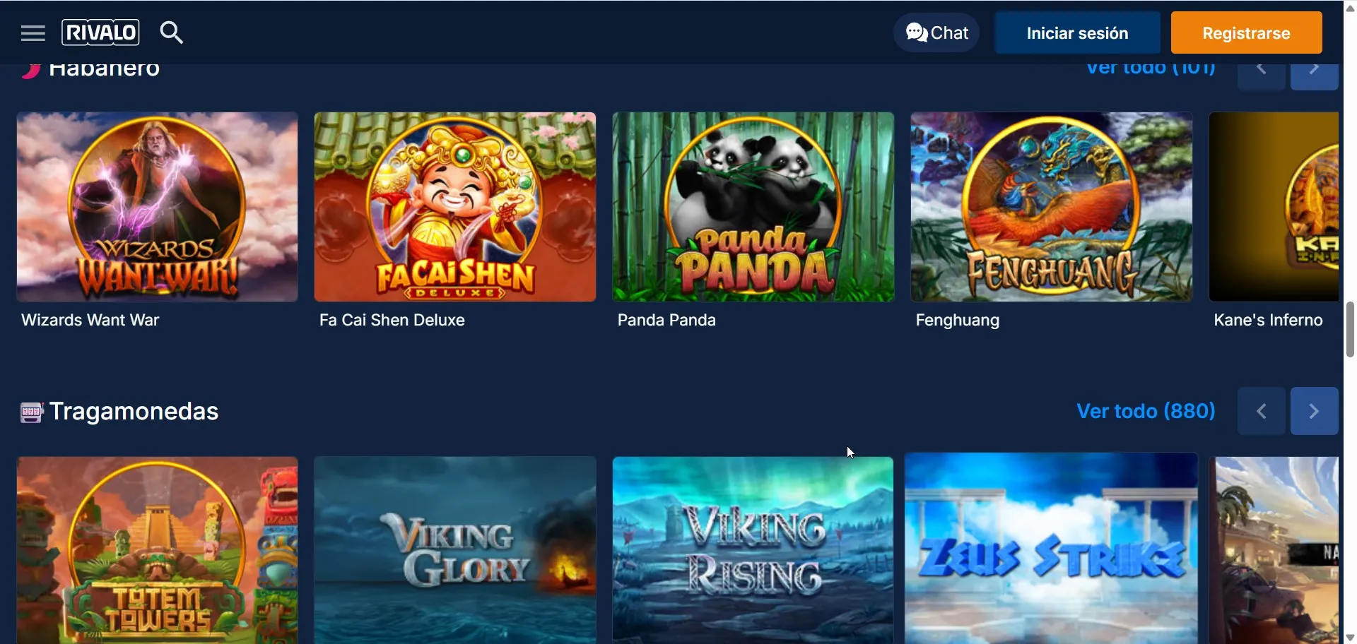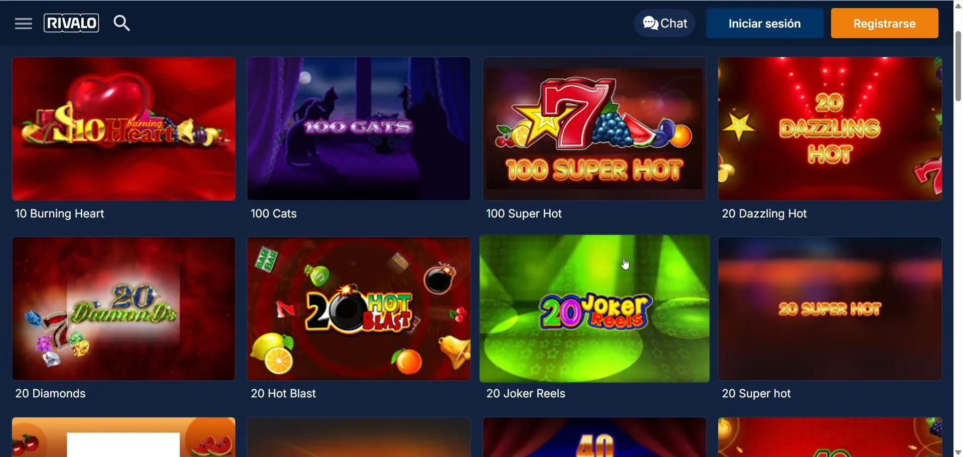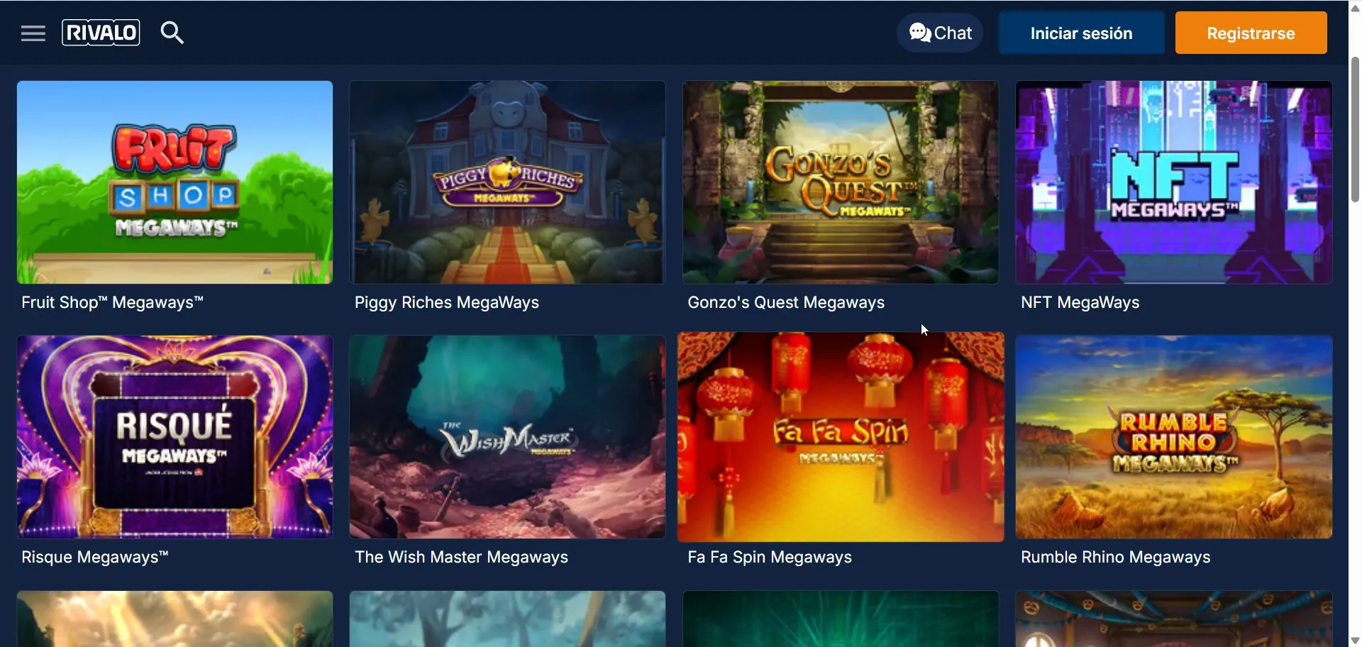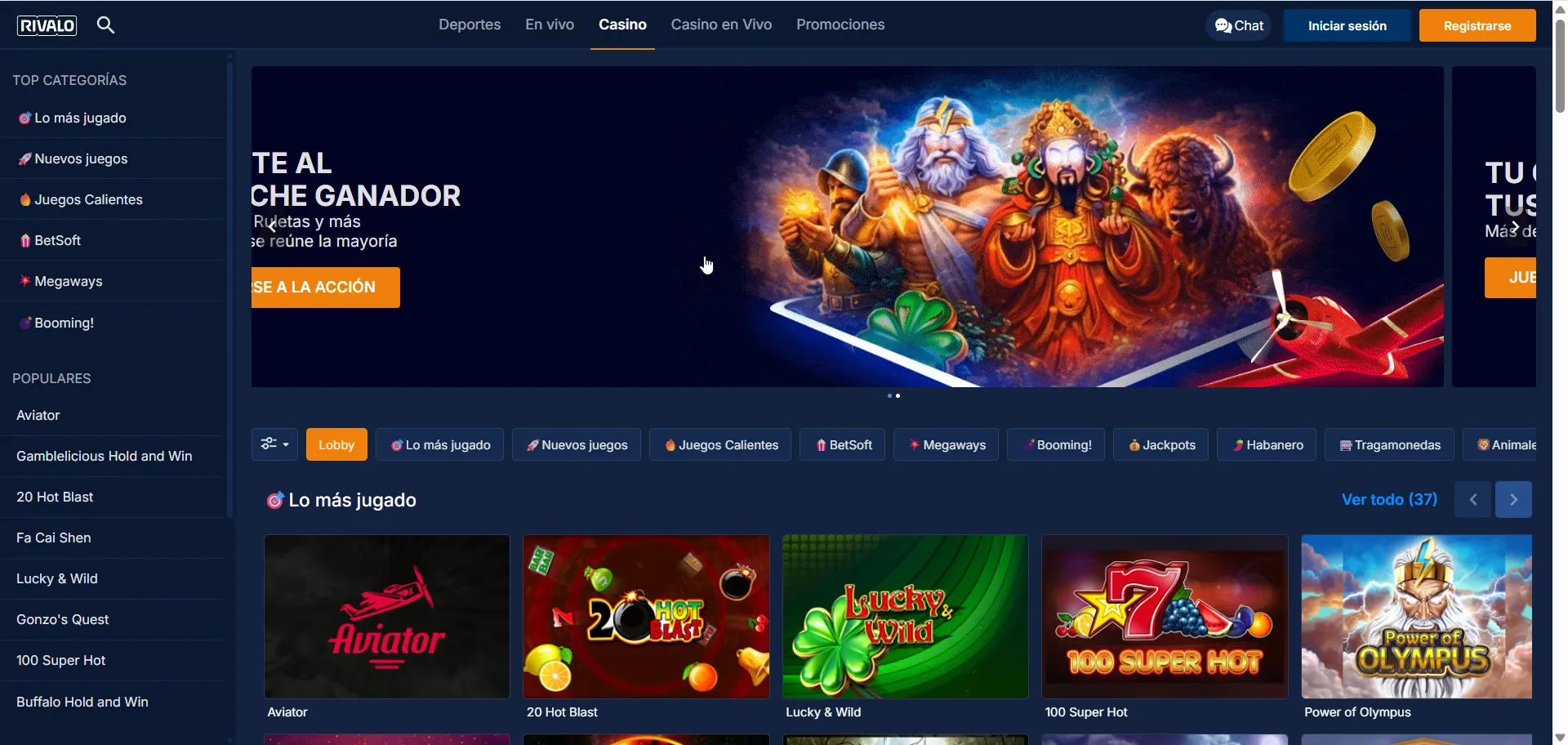 Rivalo incluye casino, casino en vivo y tragamonedas, además de mesas como ruleta y blackjack. Según la ficha técnica disponible, aparecen proveedores como Pragmatic Play, NetEnt, Red Tiger, BetSoft, Habanero y Booming Games. Nuestro equipo recomienda filtrar por proveedor y revisar RTP/reglas del juego antes de apostar.